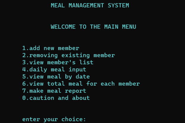 A complete solution of meal management and billing system of residential hostel. Written in about 400 lines of pure C programming. it was a 4 credit Project supervised by Mehedi Hasan Sir, based on the course CSE1201.
